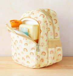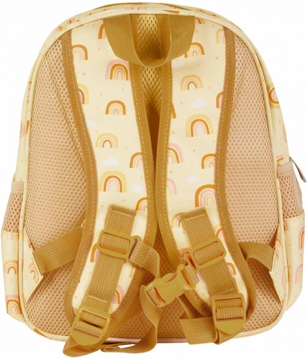 Elegante zainetto per bambini con motivo arcobaleno, ideale per l’asilo e le gite. Offre una capiente tasca principale, una tasca frontale isolata per la merenda e due tasche laterali per la borraccia. Per un trasporto confortevole include spallacci imbottiti, cintura pettorale antiscivolo e schienale imbottito e traspirante.