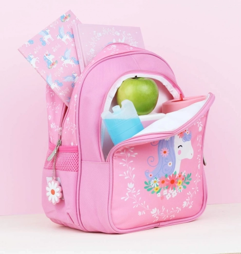 Adorabile zainetto per bambini con motivo unicorno, dotato di ampio scomparto principale, tasca frontale isolata per la merenda e tasche laterali per la borraccia. Per comfort e sicurezza include spallacci imbottiti, cinturino pettorale antiscivolo e schienale traspirante. Ideale per l’asilo, le gite e le visite dai nonni.