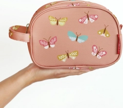 Capiente beauty case rosa con motivo di farfalle, ideale per gite, campi e vacanze. Offre un ampio scomparto principale per i prodotti per l'igiene, una maniglia pratica per un facile trasporto e una struttura resistente per l'uso quotidiano.