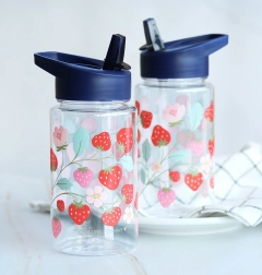 Borraccia trasparente per bambini con stampa di fragole, dotata di chiusura a prova di perdita, dimensioni ideali per asilo e gite e materiale sicuro Tritan / PP. Completa perfettamente il set con lo stesso design (zainetto e portapranzo).