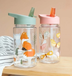 Borraccia trasparente per bambini con stampa di farfalle di A Little Lovely Company, ideale per l’asilo, le gite e l’uso quotidiano. Grazie alla cannuccia pratica e al coperchio a prova di perdita, la bevanda è sempre a portata di mano senza fuoriuscite. Capacità 450 ml, materiale resistente Tritan. Abbinabile a zainetto e porta-pranzo nello stesso design per un set completo. Senza BPA, non perde ed è leggera per le mani dei bambini.