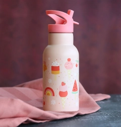 Elegante bottiglia in acciaio inox per bambini con motivo gelato e capacità di 350 ml, mantiene le bevande fresche più a lungo grazie alla doppia parete isolante. Il pratico beccuccio con cannuccia per bevande fredde e i materiali resistenti garantiscono un uso comodo e sicuro a casa, a scuola e in gita.
