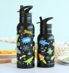 Razzi colorati, pianeti e stelle incoraggiano una corretta idratazione e rendono la bottiglia un accessorio preferito.
