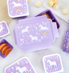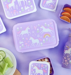 La graziosa lunch box di A Little Lovely Company entusiasmerà i bambini con il design giocoso di unicorni e arcobaleno e conquisterà i genitori con la lavorazione ben studiata. Grazie al coperchio con chiusura ermetica, il contenuto rimane fresco e ben sigillato. Il vassoio estraibile con due scomparti permette una chiara suddivisione di frutta, verdura, pane o dolcetti.