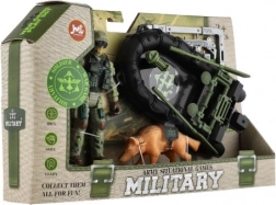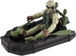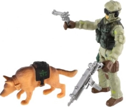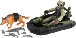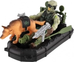 Figura del soldato, gommone in plastica (stile gonfiabile), cane da servizio, armi e accessori