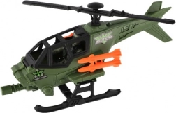L’elicottero militare verde con rotori neri e missili arancioni si distingue per l’aspetto realistico che stimola scenari di gioco avvincenti.