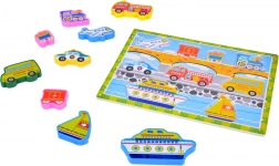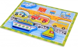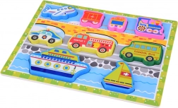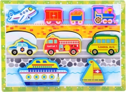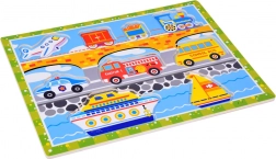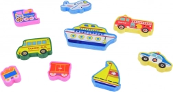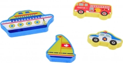 Include diversi mezzi di trasporto come scuolabus, camion dei pompieri, aereo e altri.