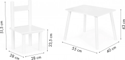 Tavolo: 55 × 40 × 43 cm. Sedia: altezza 51,5 cm, larghezza 28 cm, altezza seduta 23,5 cm. Ergonomia pensata per il comfort e la corretta postura dei bambini dai 3 anni.