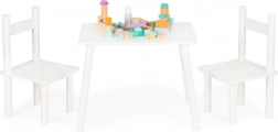 Create per i bambini un angolo tutto loro per giocare e imparare. Il set in legno ECOTOYS, in bianco, unisce il design scandinavo essenziale a una costruzione resistente: le gambe in pino massello offrono stabilità e il piano in MDF è facile da mantenere pulito. Il set include un tavolo e due comode sedie con proporzioni coordinate.