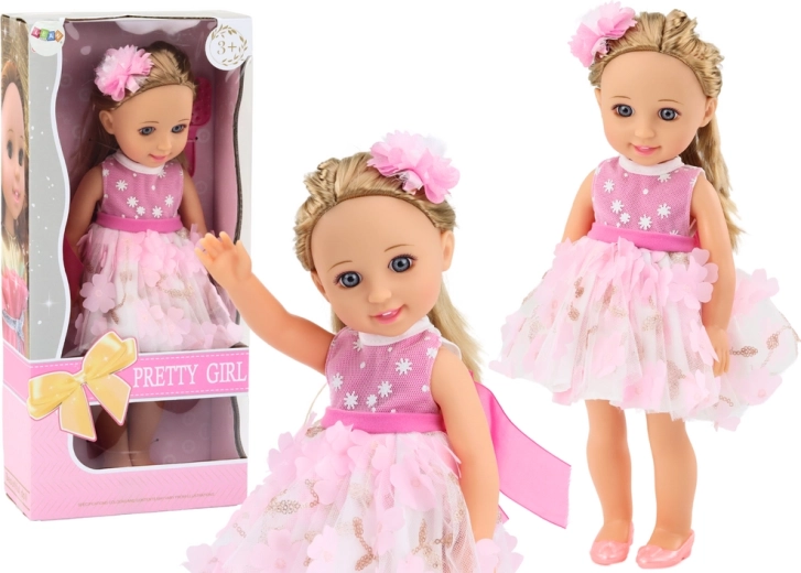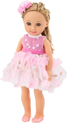 La bambola ha lunghi capelli biondi, facilmente pettinabili in vari modi, ed è fornita con una spazzola per pettinare e acconciare i capelli. I capelli sono inoltre impreziositi da una graziosa molletta che dona alla bambola un tocco speciale. Indossa un bellissimo abito rosa e bianco decorato con fiori rosa e dettagli dorati. L’abito è elegante e alla moda, ideale per ogni occasione. La bambola indossa scarpe rosa perfettamente abbinate al vestito. Ha un trucco delicato che ne esalta l’eleganza, con occhi e labbra dipinti con cura per un aspetto espressivo e affascinante.