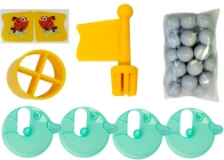 4 pedine pinguino, parti del ghiacciaio (4 corsie), piattaforme girevoli, palle di neve, bandierina, adesivi, accessori