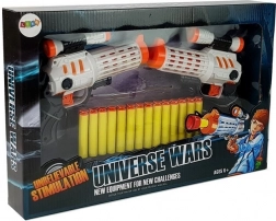 Il set completo in una confezione regalo 'Universe Wars' include 2 pistole e munizioni, ed è un ottimo regalo per tutti i piccoli eroi dello spazio.