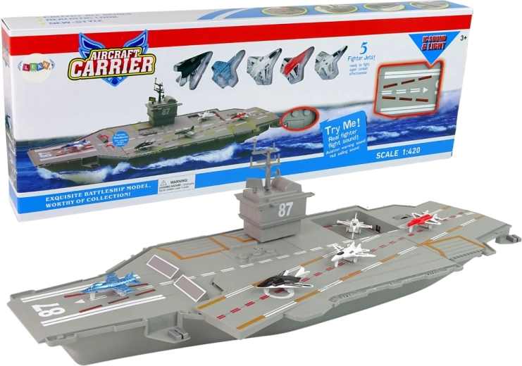 Un enorme giocattolo portaerei con cinque jet offre ai bambini infinite dosi di azione e fantasia. A bordo trovi pulsanti che attivano effetti sonori e luminosi, un ponte di comando retroilluminato in rosso e una piattaforma elevatrice a comando manuale. Le dimensioni generose, il design militare e la confezione completa con 2× batterie AG13 lo rendono un regalo perfetto per i piccoli appassionati di marina.