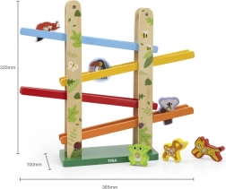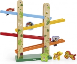 La pista in legno per animali Jungle Slider del marchio VIGA è progettata per intrattenere ed educare i bambini. Grazie alla lavorazione di qualità e ai componenti colorati, questo giocattolo offre esperienze di gioco coinvolgenti. Gli animali possono scivolare lungo i quattro livelli di rampe, cosa che sviluppa la coordinazione e la motricità fine.