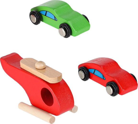 La confezione include numerosi accessori: 2 macchinine in legno con ruote scorrevoli, elicottero con rotore girevole, 4 segnali stradali, 3 coni e colonnina di rifornimento. Tutti i pezzi sono realizzati in legno levigato e verniciati con colori atossici per un gioco sicuro.