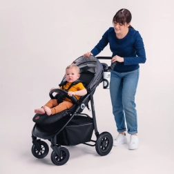 La capottina XXL con filtro UPF 50+ offre protezione affidabile dal sole, mentre il pannello di ventilazione rimovibile garantisce aerazione nelle giornate calde. La sicurezza è affidata alle cinture a 5 punti, al corrimano removibile e agli inserti riflettenti su capottina e cestello. I genitori apprezzeranno il manico telescopico a 11 livelli (75–113 cm), la tasca dietro lo schienale e il cestello con cerniera con portata di 3 kg.