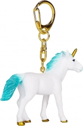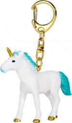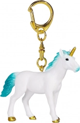 Un unicorno bianco con criniera turchese e corno e zoccoli dorati dona un tocco unico a chiavi e borse.