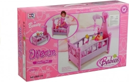 Questa culla per bambole dal design elegante ricorda fedelmente una vera culla per bambini. La finitura rosa‑viola con cuoricini e ornamenti è completata da una giostrina con animaletti sospesi, grazie alla quale la bambola si addormenta facilmente. Inclusa biancheria da letto morbida coordinata al design della culla.