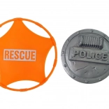 Il disco e il distintivo con motivi dei servizi di soccorso stimolano l’immaginazione dei bambini e le loro storie durante gli interventi di polizia.