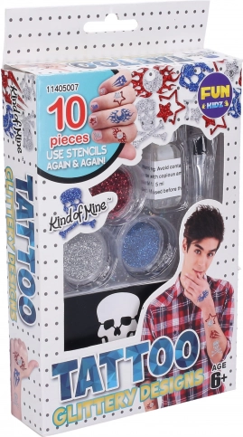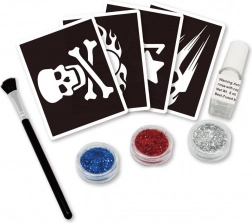 - pennello; 4 stencil (riutilizzabili); colla per tatuaggi; glitter in 3 colori; istruzioni