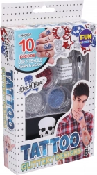 Crea i tuoi design originali con questo set per tatuaggi temporanei con glitter pensato per ragazzi. Include 4 stencil riutilizzabili, 3 colori di glitter, colla, pennello e istruzioni – divertimento facile per bambini dai 6+.