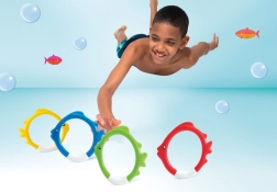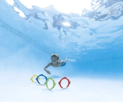 Dopo essere stati lanciati in acqua, gli anelli si posizionano automaticamente sul fondo, offrendo ai bambini un obiettivo chiaro per l’immersione e permettendo di esercitarsi in modo naturale e divertente.