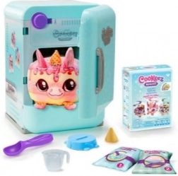 Trasforma la tua pasticceria in un gioco! Il set COOKEEZ MAKERY dolcetti ghiacciati – frigorifero ti permette di mescolare gli “ingredienti”, impastare, mettere nella forma, decorare con slime e cialda e poi inserire tutto nello speciale “frigorifero”. Imposta la temperatura a –10 °C, chiudi lo sportello e dopo 20 secondi ti aspetta una sorpresa: una personaggina tortina di peluche profumata, che trema per il freddo ed emette suoni divertenti.