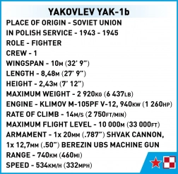 Con questo set di costruzione puoi costruire un modello storico dell'aereo da caccia Yakovlev Yak-1b, che ha servito nelle forze aeree durante la Seconda Guerra Mondiale. Grazie al suo design elegante e facilità di manutenzione, era popolare tra i piloti e il personale di terra. Questo aereo, noto per la sua eccellente capacità di performance grazie al buon rapporto tra potenza e peso ridotto, era un temuto avversario in aria.