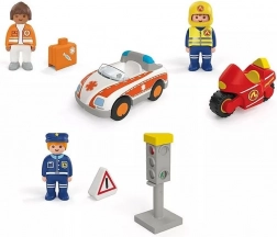 Scoprite un divertente set per i più piccoli con personaggi dei soccorritori, un poliziotto e un pompiere in moto. I bambini allenano l'immaginazione, la motricità fine e le basi dell'educazione stradale grazie al semaforo luminoso con cambio di colore, alla vettura di soccorso con gancio e alla moto con effetto rombante.