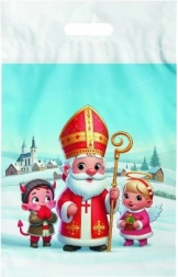 Elegante borsa in plastica con stampa di San Nicola, un angelo e un diavolo, ideale per confezionare le sorprese di San Nicola. Il formato 29×46 cm offre spazio sufficiente per dolciumi, giocattoli e regali più grandi e conquista con un motivo vivace e allegro.