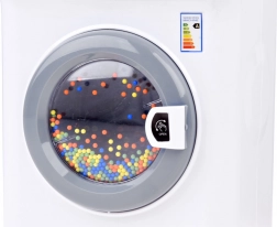 Lo sportello trasparente permette di vedere le palline colorate nel cestello, che ruota durante il lavaggio e simula l’effetto dell’acqua.