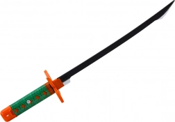 La lama nera e l'evidente impugnatura arancione‑verde con motivo geometrico conferiscono alla spada uno stile autentico. La plastica leggera è adatta al gioco dei bambini e facilita le manovre.