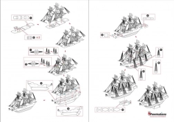L’assemblaggio avviene senza colla: le parti si uniscono mediante fermi con linguette, che piegherai con piccole pinze. Il modello finito della nave GOLDEN HIND spicca come decorazione di stile su una mensola, sulla scrivania o in vetrina.