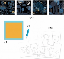 - 1 supporto in schiuma e cartone spesso, 16 sfondi illustrati, 16 sagome, 1 ago da perforazione, 1 libretto di istruzioni
