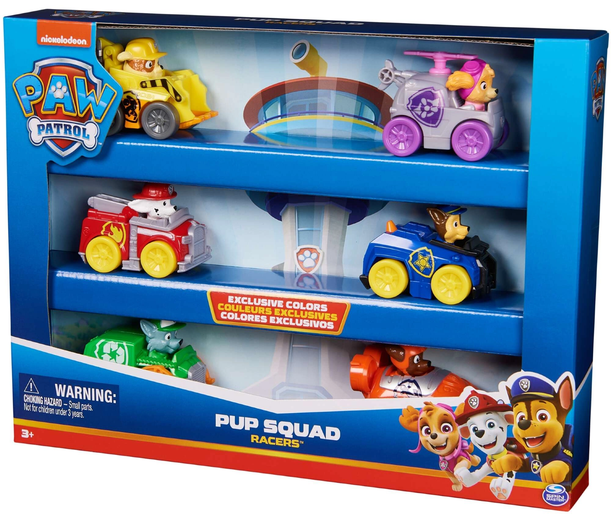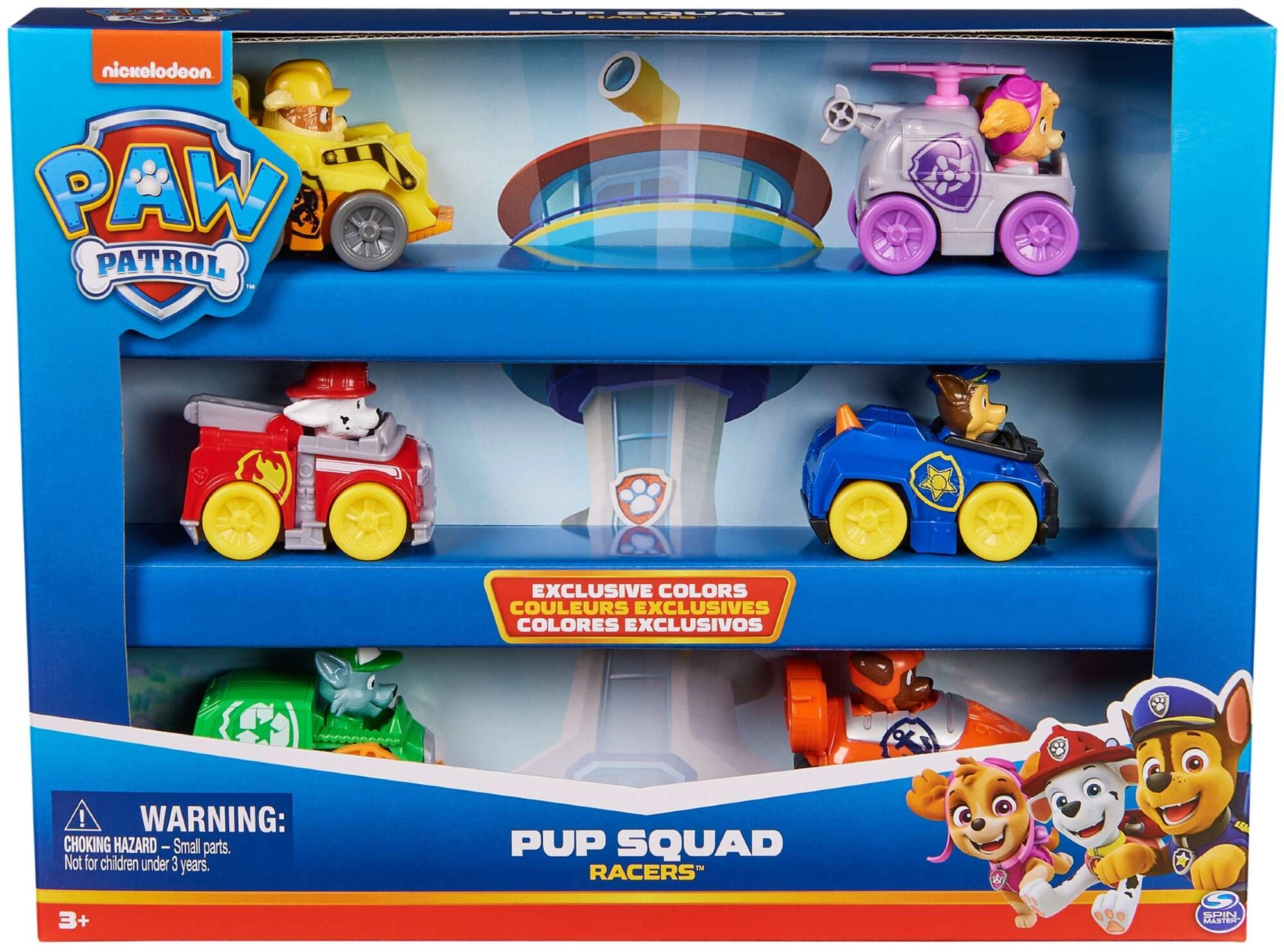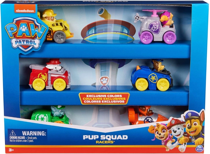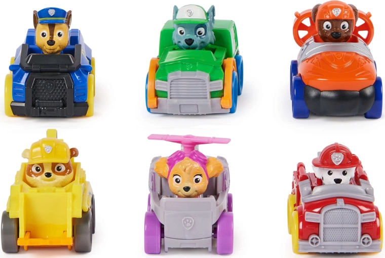 Il set Pup Squad Racers include sei veicoli dettagliati con personaggi fissi dei PAW Patrol – Chase, Marshall, Skye, Rocky, Rubble e Zuma. Le macchinine sono realizzate in plastica resistente, hanno movimento a spinta e, grazie alle dimensioni ridotte, sono facili da manovrare e trasportare.