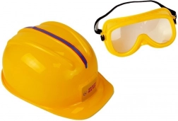 Casco giallo e occhiali trasparenti offrono una simulazione di protezione per un gioco sicuro e realistico.