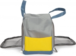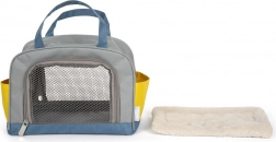 Borsa da trasporto grigia e blu con maniglie doppie e tasche gialle, è una soluzione ideale per il trasporto di piccoli animali domestici, garantendo comfort e sicurezza al tuo animale domestico.