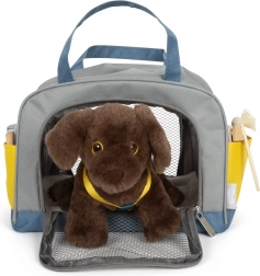 Il set include un cane di peluche, una borsa da trasporto con materassino morbido, ciotola, contenitore per bocconcini, pinzette, benda, scatolina per medicinali, giocattolo, spazzola e siringa a molla.