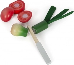 Gli alimenti sono uniti da velcro, consentendo di "tagliarli" con il coltello di legno fornito. I bambini possono così giocare a cucinare come i grandi.