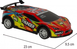 Elegante auto RC THUNDER rossa per bambini dai 6 anni offre una guida veloce e divertente in casa e all’aperto. Grazie alle luci LED, agli pneumatici in gomma e alla batteria da 3,7 V è ideale per i piloti alle prime armi. Il telecomando intuitivo garantisce manovre facili e le dimensioni compatte 23 × 9,5 × 5 cm si adattano a ogni mano di bambino.