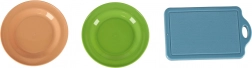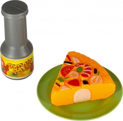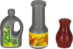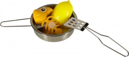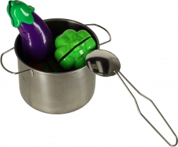 • Dotazione ricca: padella, 2 pentole con coperchi, colapasta, 4 utensili da cucina, tagliere, 2 piatti, coltello in plastica e una selezione colorata di alimenti (ad es. pizza, broccoli, salsiccia, pollo, anguria, carota, banana, limone, pomodoro, uovo, melanzana, aragosta, peperone, pesce, carne, salse, sale, olio d’oliva).