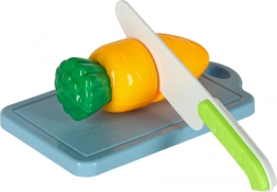 Frutta e verdura sono divise in parti tramite velcro/magnete: i bambini possono tagliarle in sicurezza con il coltello di plastica e servirle sui piattini.