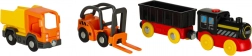 La gru funzionante e il carrello elevatore permettono di caricare e scaricare il carico. I bambini esercitano la motricità fine e creano le proprie storie ambientate nel cantiere.