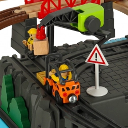 Questa pista ferroviaria in legno completa porta ai bambini l’affascinante mondo del trasporto e del cantiere. Con i singoli pezzi costruirai un tracciato articolato con dislivelli, lungo il quale la locomotiva in legno si muove autonomamente. Gli elementi a tema cantiere – gru, carrello elevatore, coni e segnali – creano una scena realistica e invitano al gioco libero.