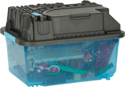 Il robusto box blu funge durante il gioco da elemento del tracciato e, dopo, da pratico contenitore. Mantiene tutti i pezzi in un unico posto.