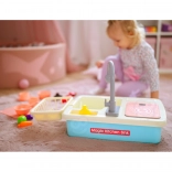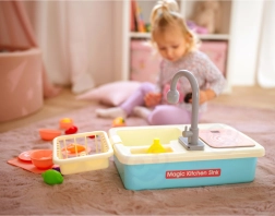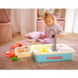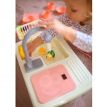 La pompa integrata, inserendo 2× AA, fa circolare l’acqua nel lavello. I bambini potranno divertirsi a sciacquare i piatti in modo realistico e a giocare in sicurezza senza disordine.