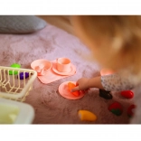 Il set include piatti, ciotole, tazzine, posate, teiera, tagliere e alimenti in plastica con chiusura a strappo (frutta e verdura) per un “taglio” sicuro. I bambini possono così preparare il menù, servire e poi lavare i piatti – dal gioco alla responsabilità il passo è breve.
