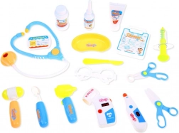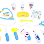 Stetoscopio, termometro, otoscopio, misuratore di pressione, siringa, forbici, bisturi, occhiali e altri accessori – tutto per un gioco del dottore completo.