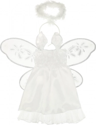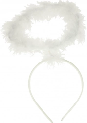 Il set include anche un cerchietto di plastica con materiale morbido e piumato che forma un'aureola.