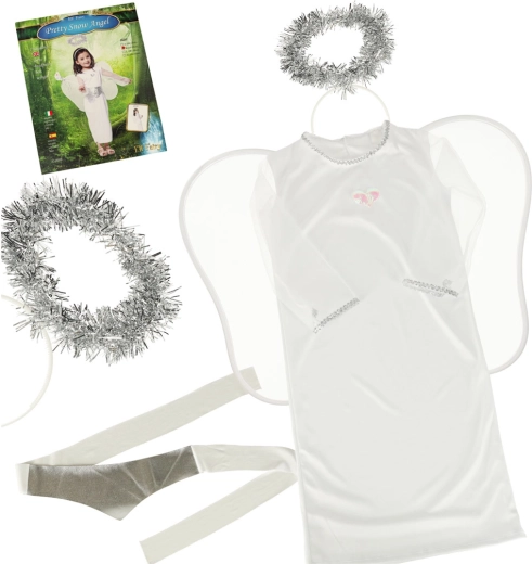 Il costume include una gonna bianca, una cintura, una fascia con aureola e ali d'angelo, che completano perfettamente l'aspetto dell'angelo.
